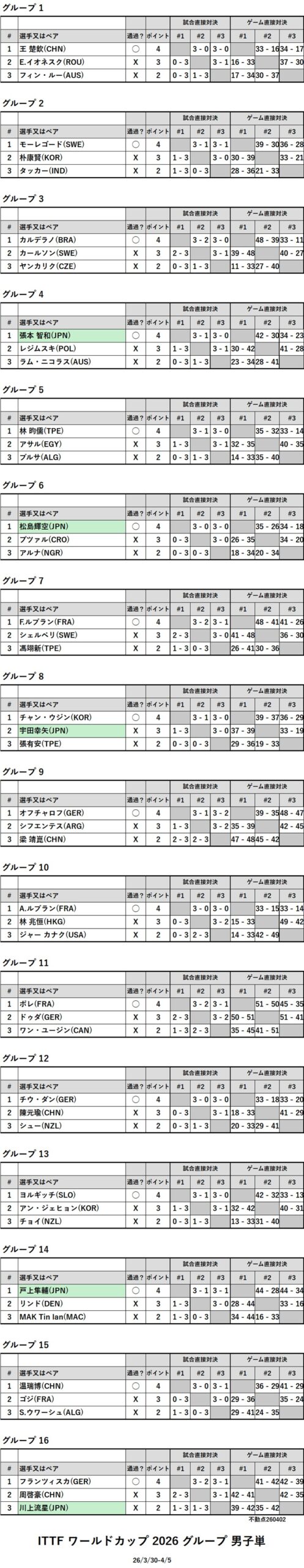 2026 ITTF 男女ワールドカップ マカオ グループ 男子単
