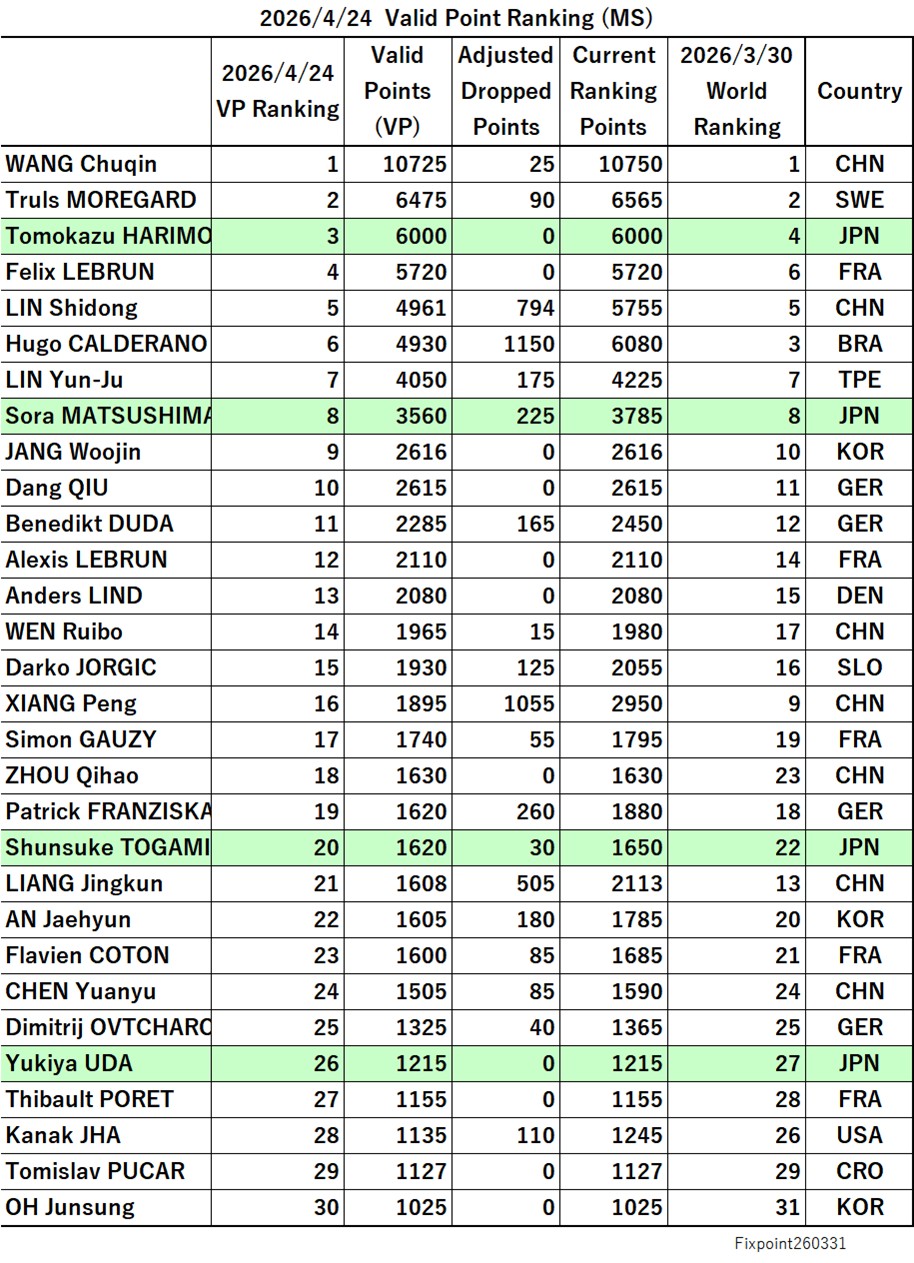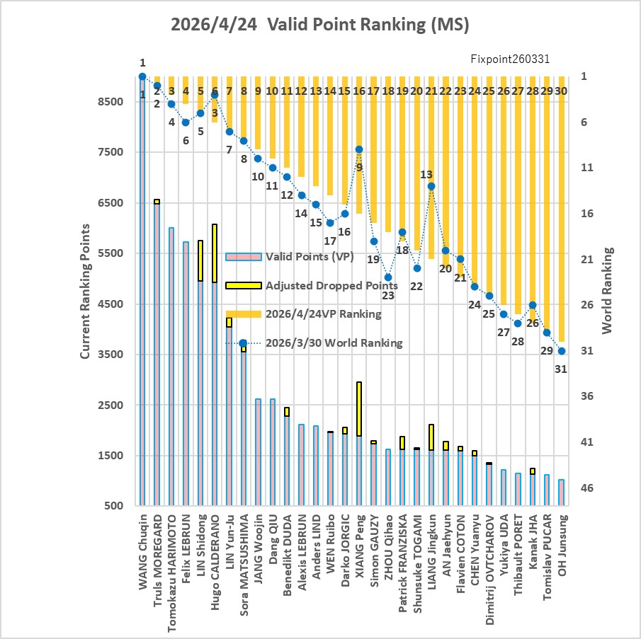 2026/4/24 Valid Point Ranking (MS) (Based on 2026 Week #11 - March 30 World Ranking)