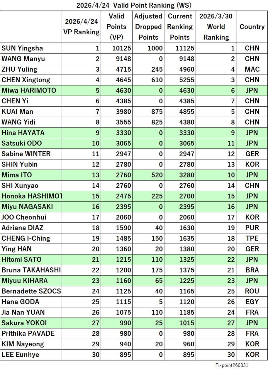 2026/4/24 Valid Point Ranking (WS) (Based on 2026 Week #11 - March 30 World Ranking)