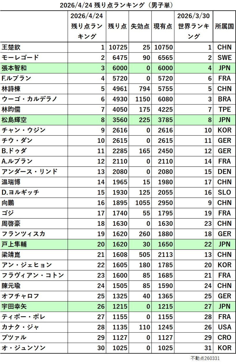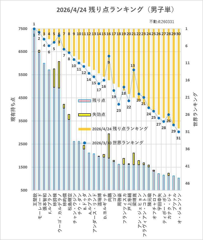 2026年4月24日の残り点ランキング(男子)(26/3/30からの計算)