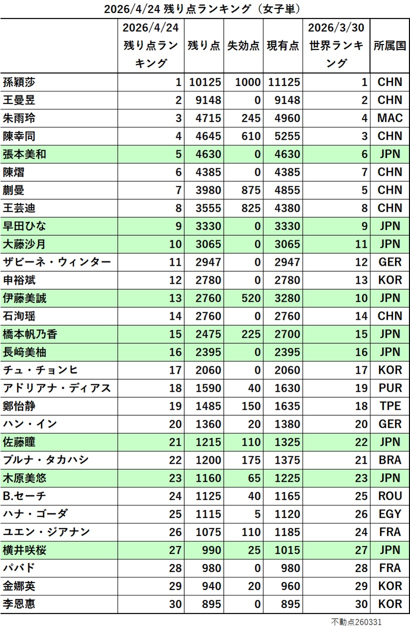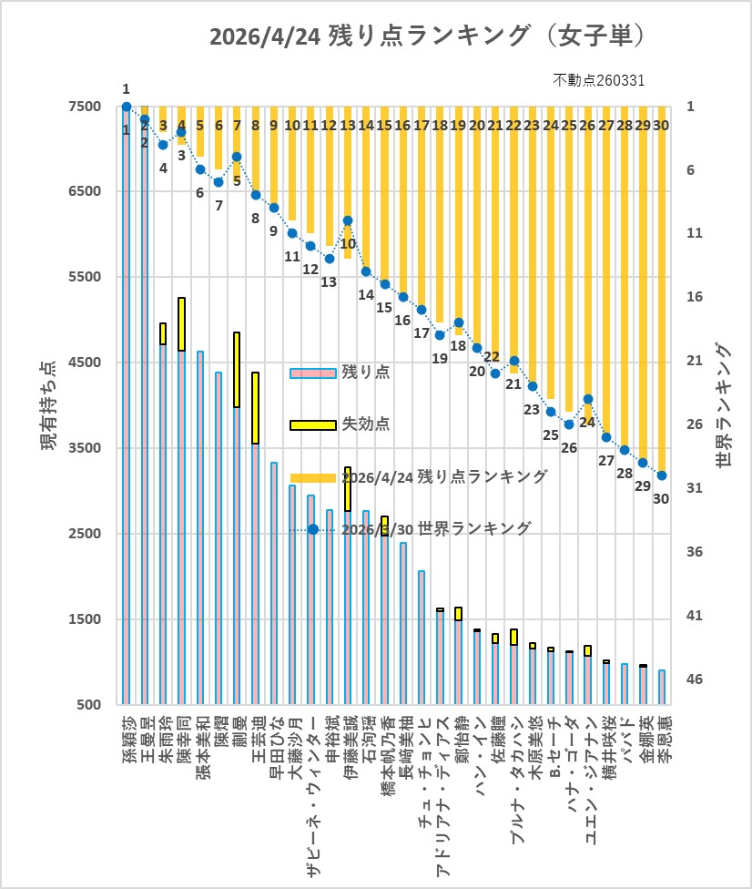2026年4月24日の残り点ランキング(女子)(26/3/30からの計算)