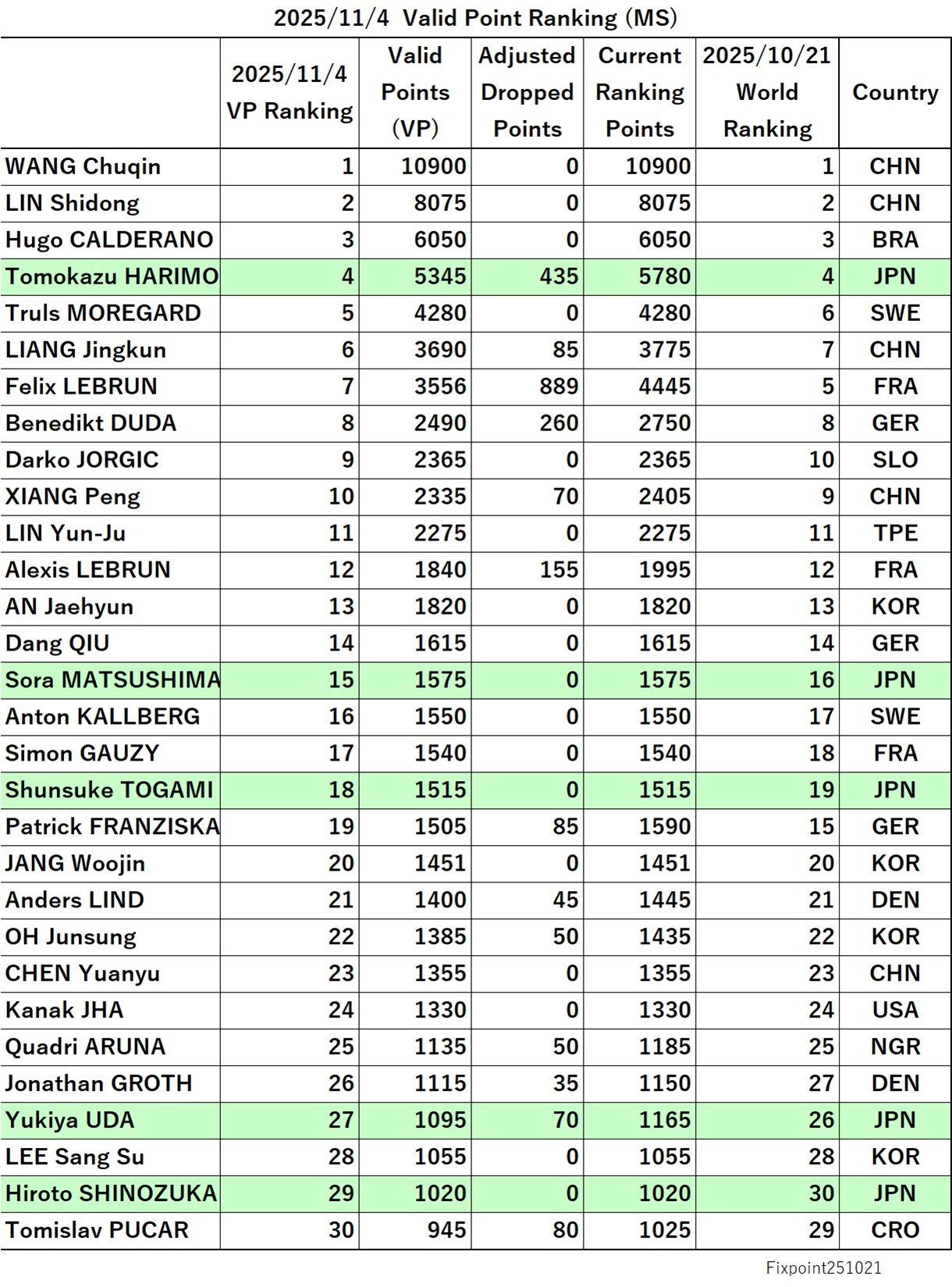 2025/11/4 Valid Point Ranking (MS) (Based on 2025 Week #43 - October 21 World Ranking)