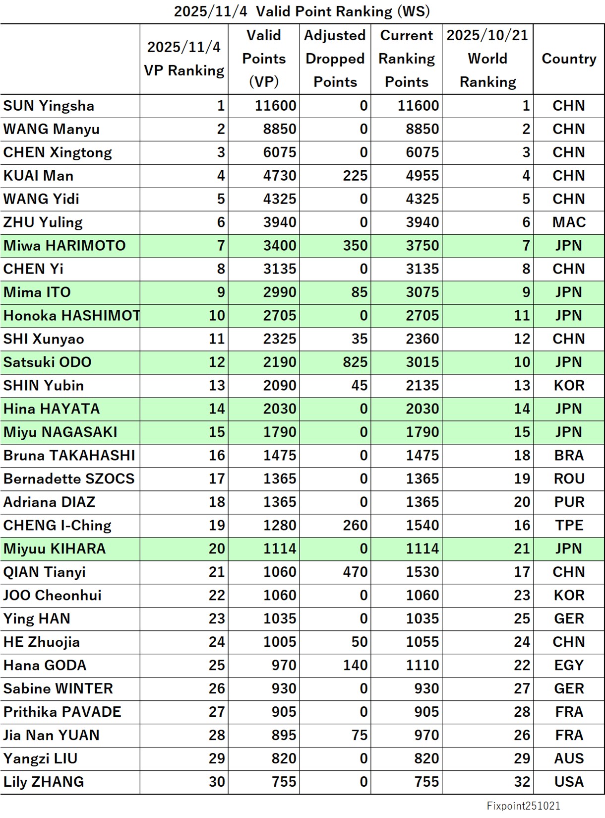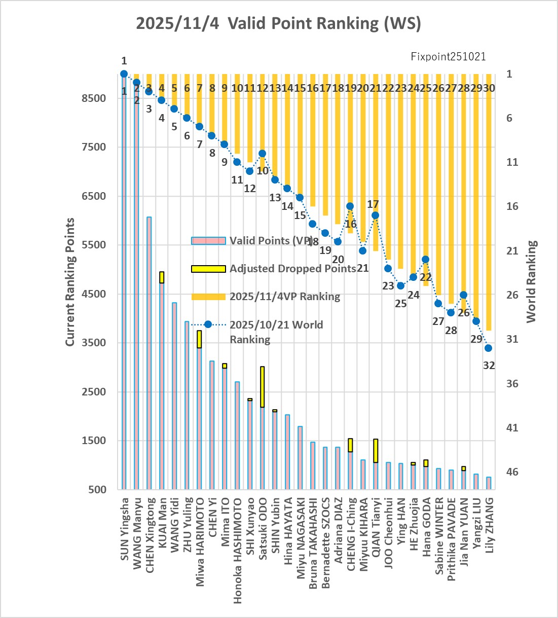 2025/11/4 Valid Point Ranking (WS) (Based on 2025 Week #43 - October 21 World Ranking)