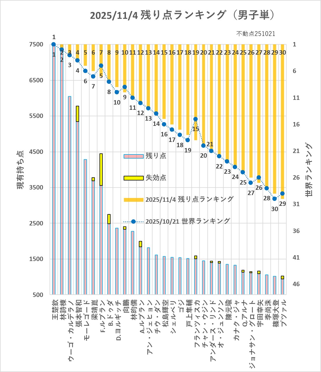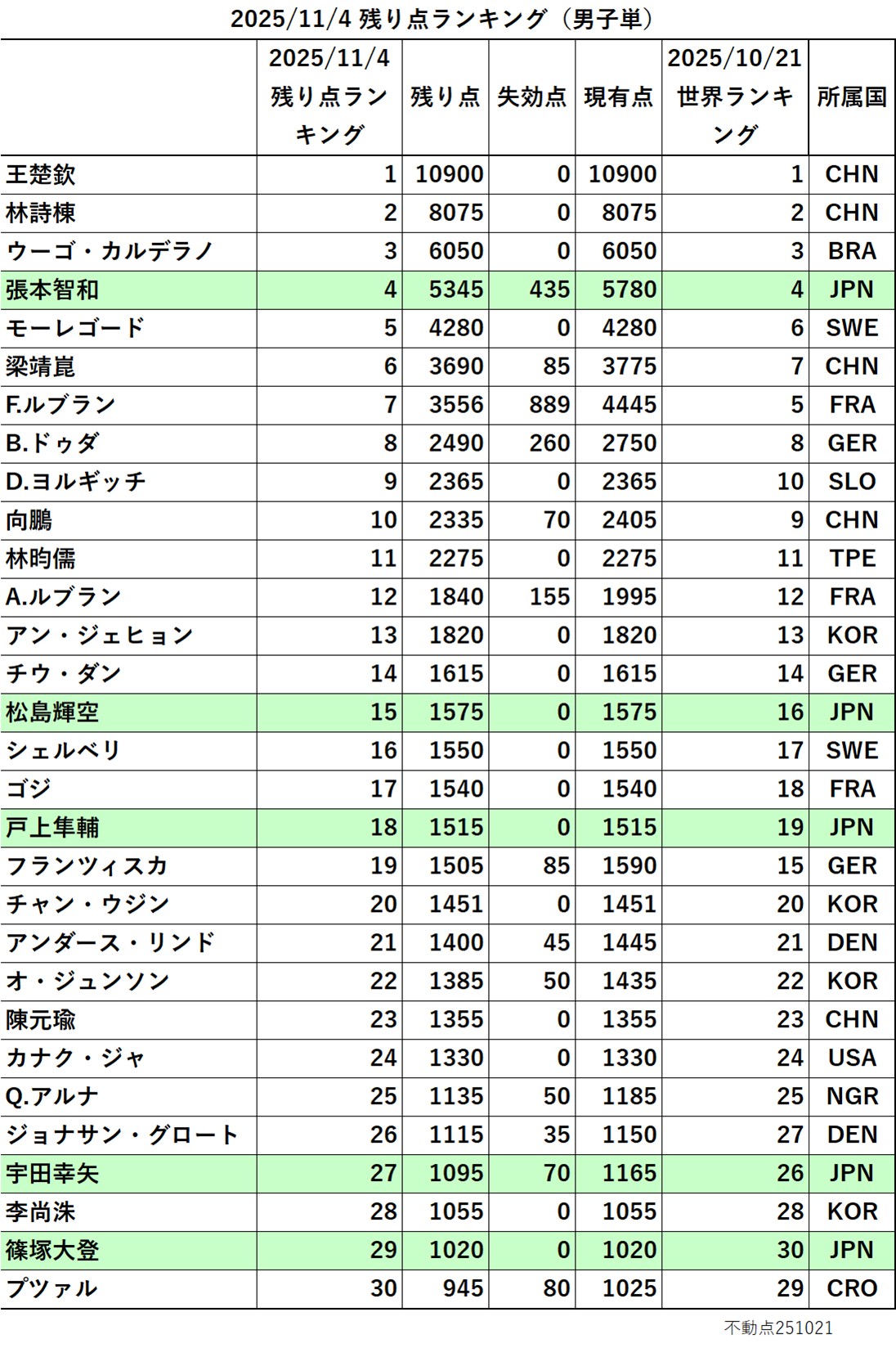 2025 WTTファイナルズ香港の5週間前11月4日の世界ランキングの残り点を計算した。