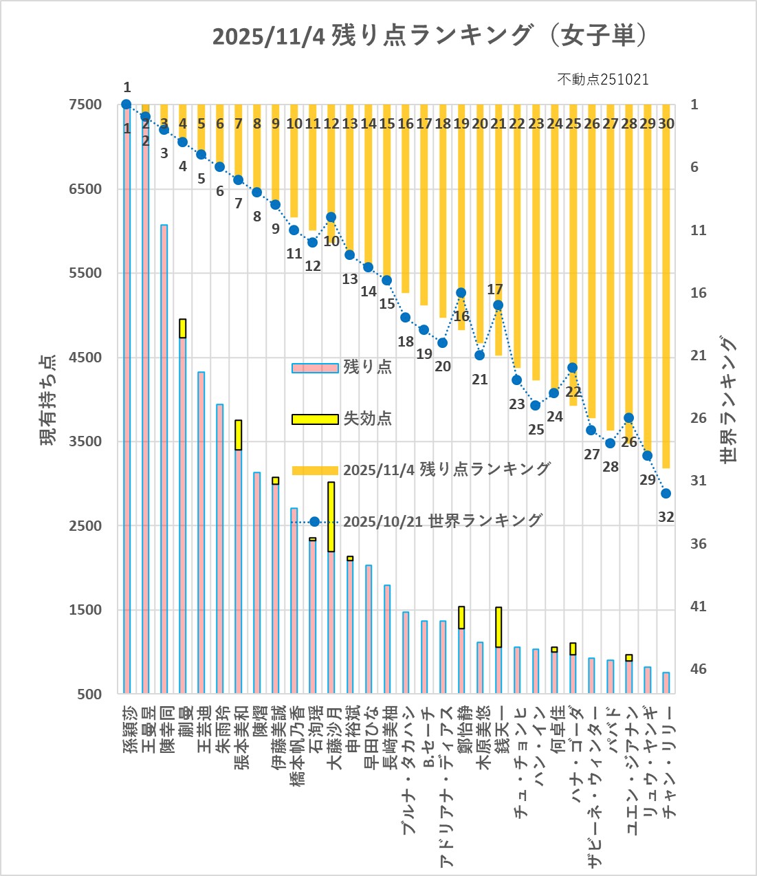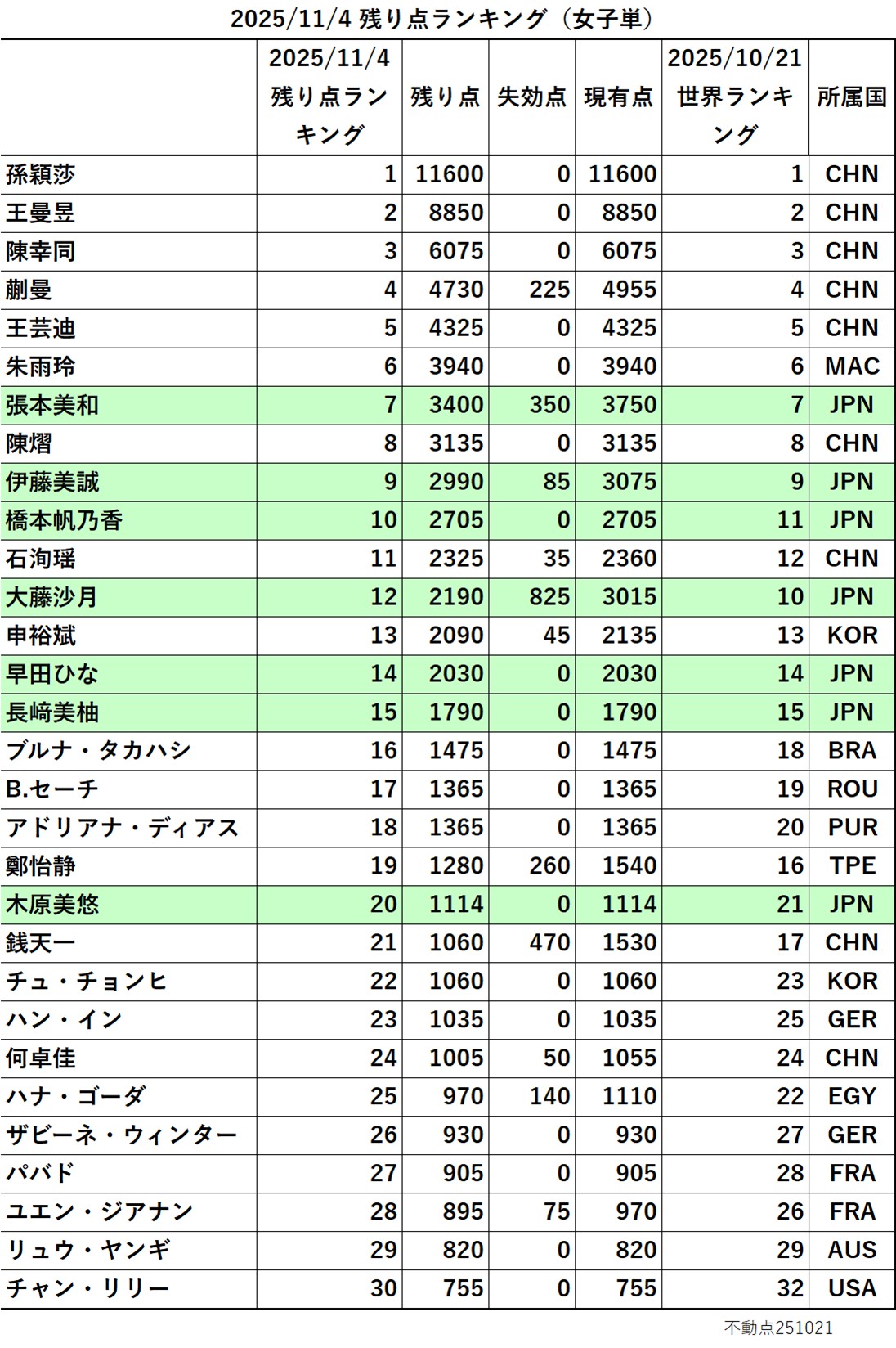 2025年11月4日の残り点ランキング(女子)(25/10/21からの計算)