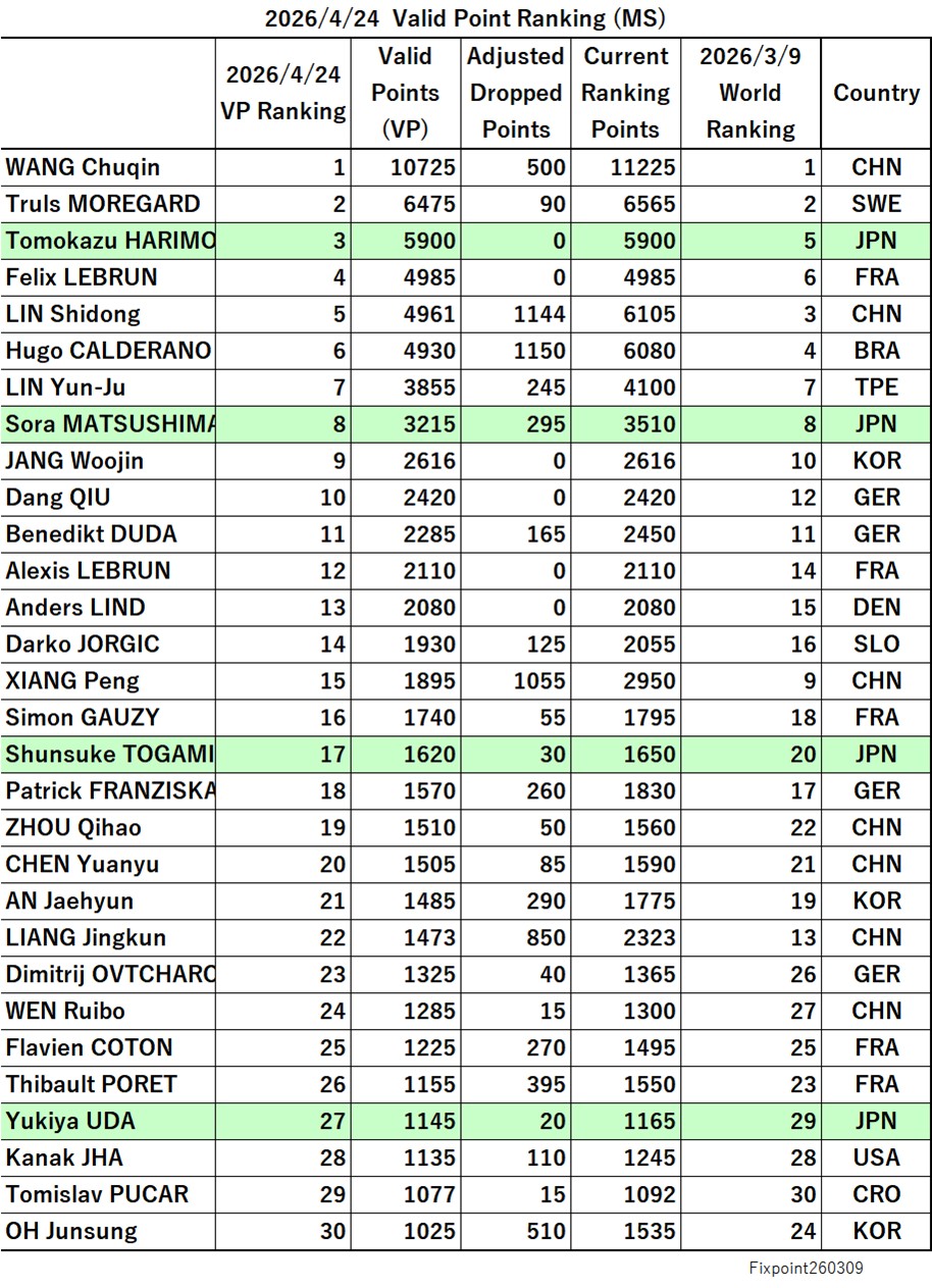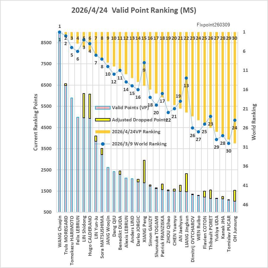 2026/4/24 Valid Point Ranking (MS) (Based on 2026 Week #11 - March 9 World Ranking)