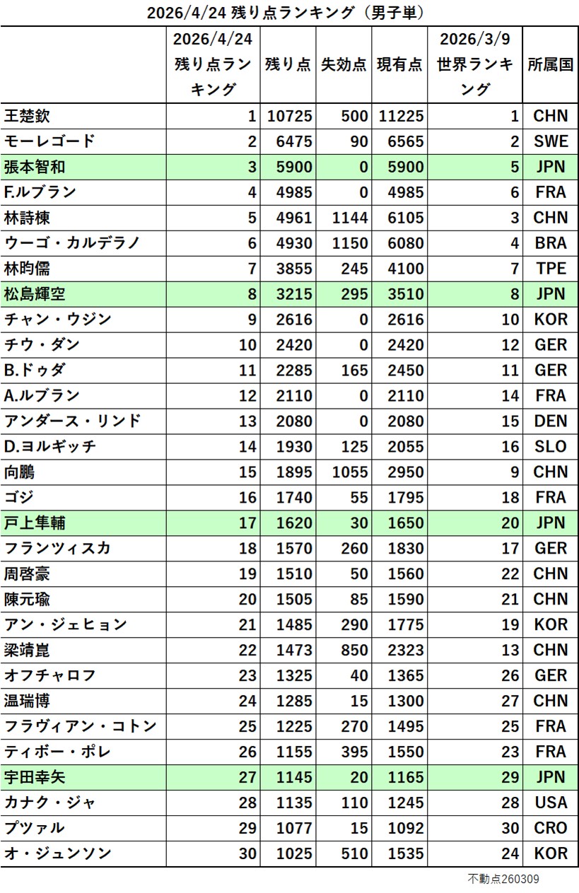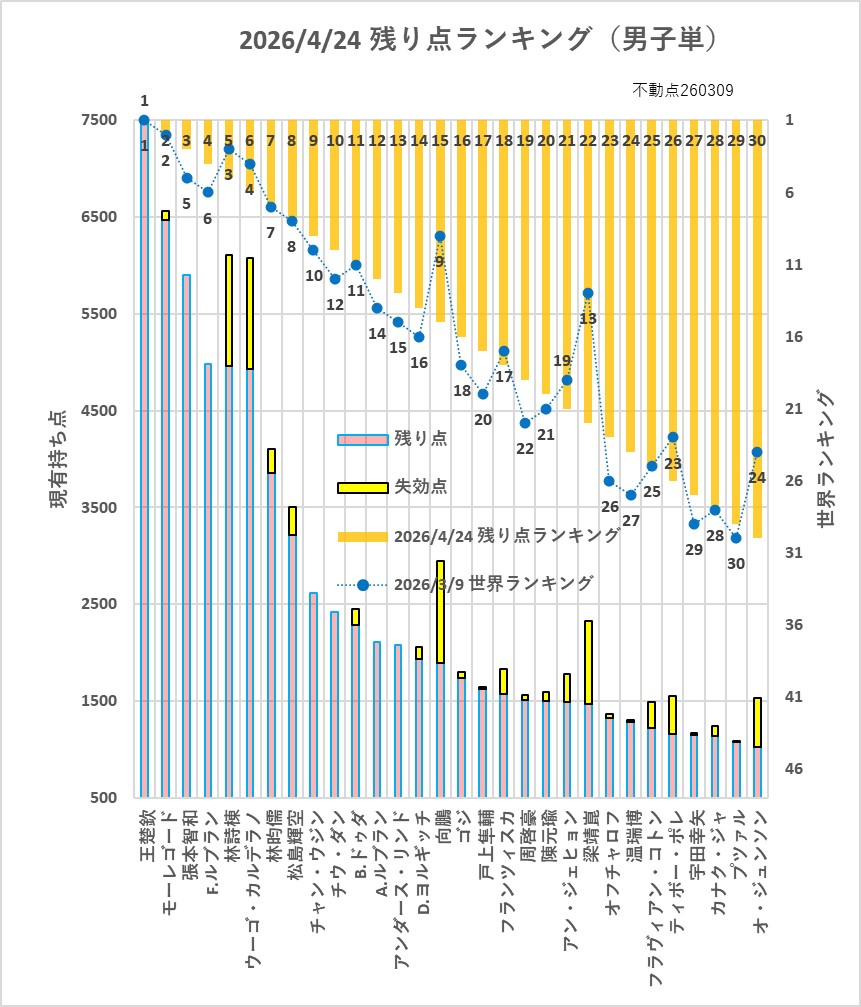 2026年4月24日の残り点ランキング(男子)(26/3/9からの計算)