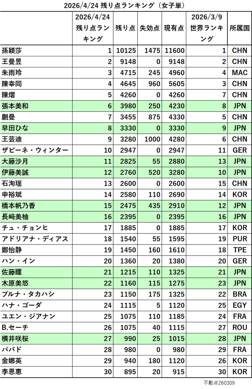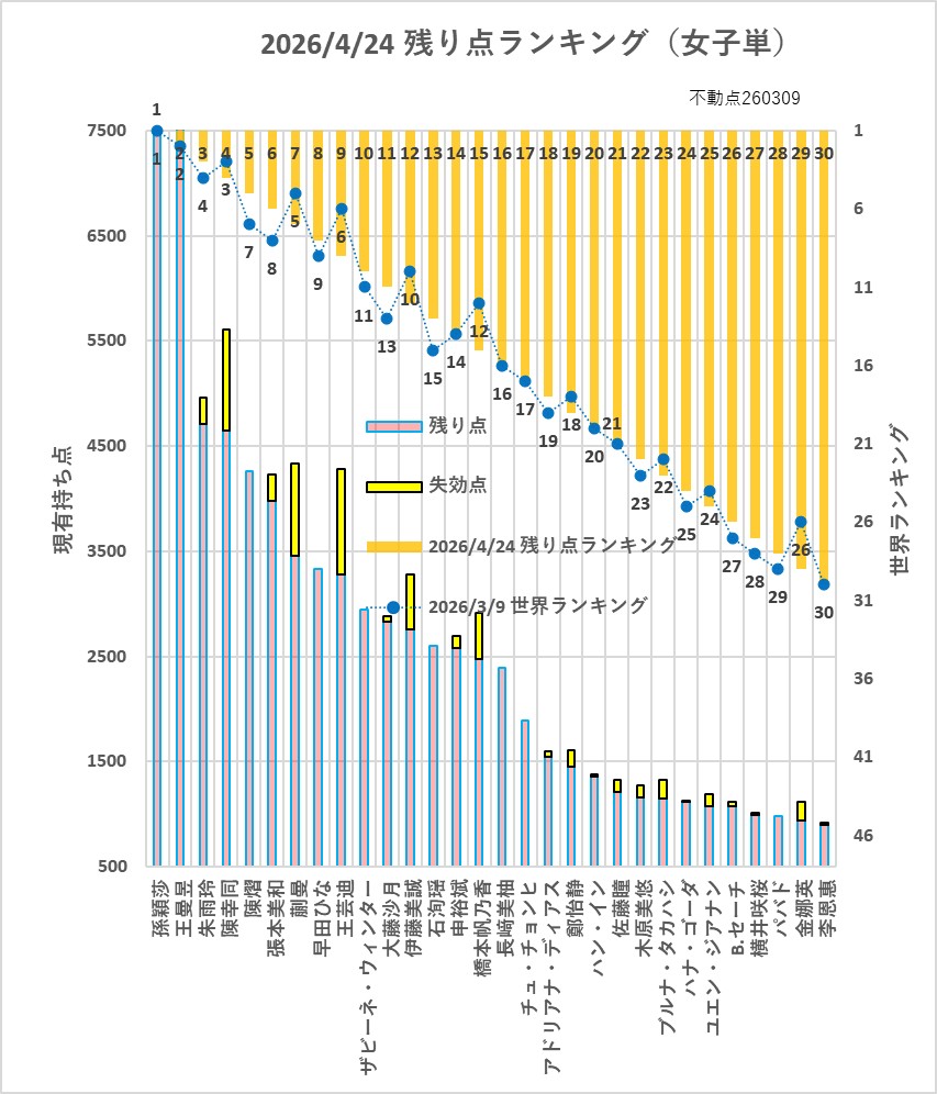 2026年4月24日の残り点ランキング(女子)(26/3/9からの計算)