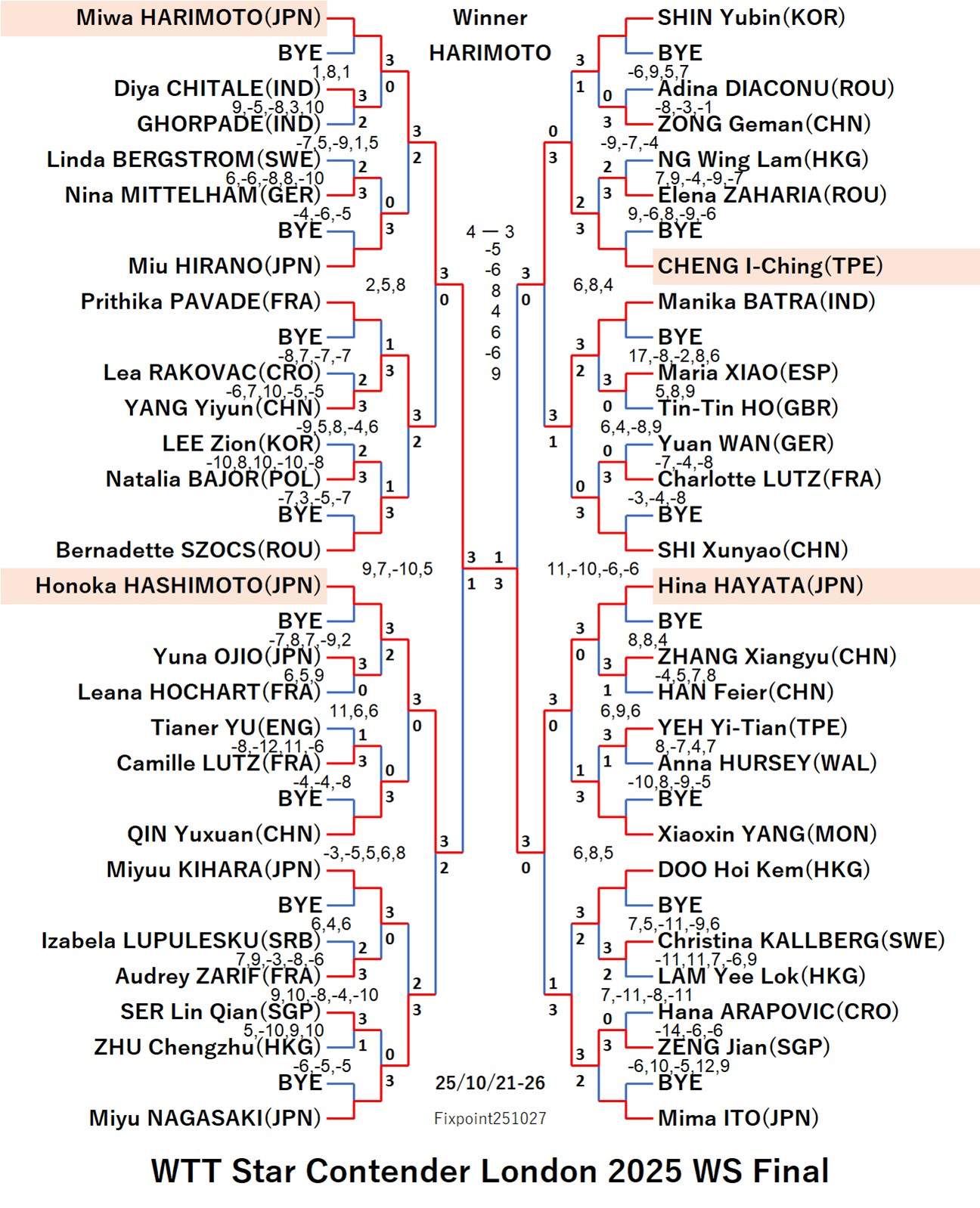 WTT Star Contender London 2025 WS (2025/10/21〜10/26)