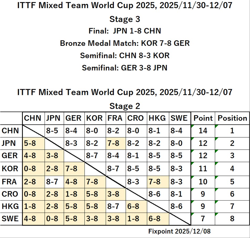 ITTF Mixed Team World Cup 2025 (2025/11/30〜12/07 Chengdu, China)